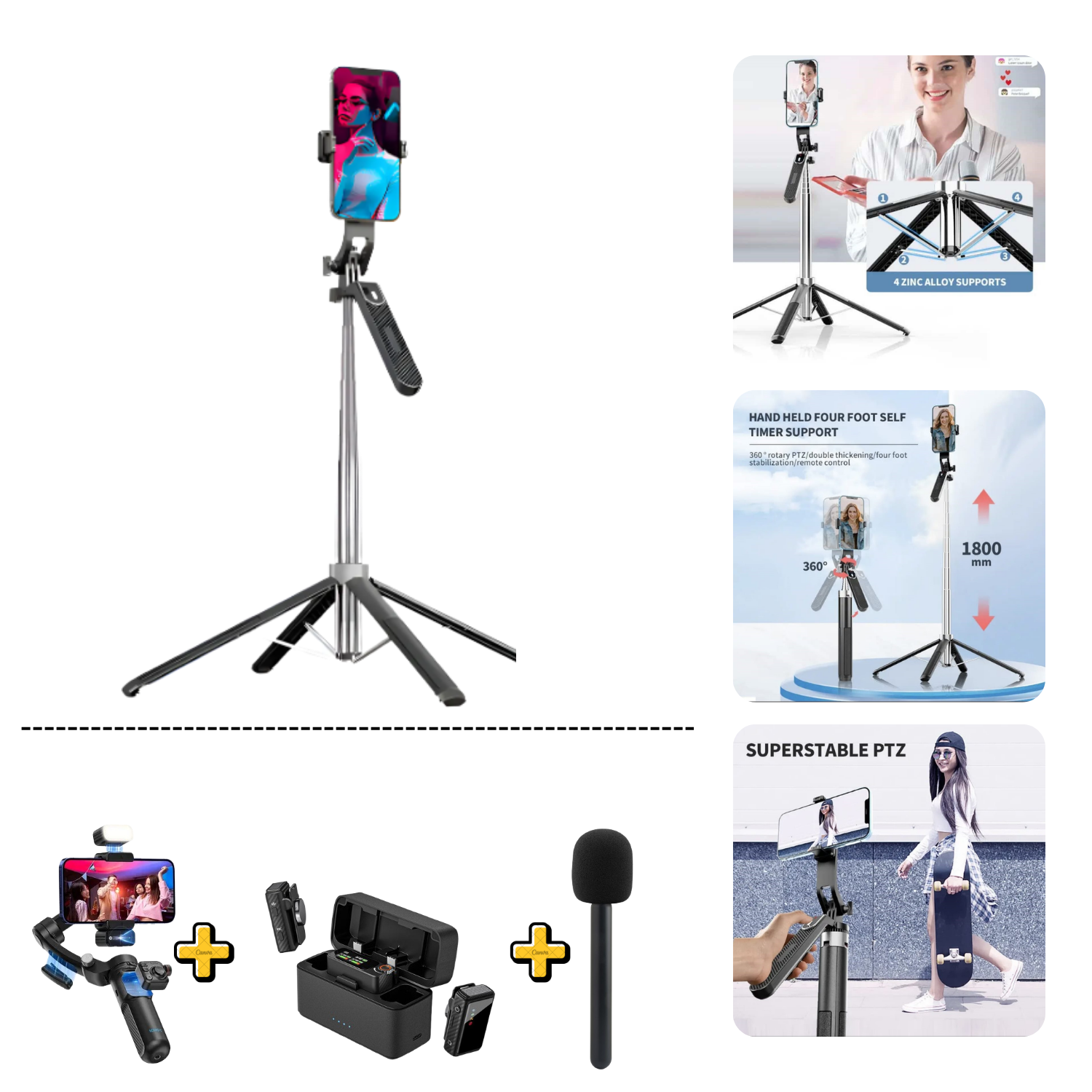 Sirve para grabar sin sostener el celular. Se ajusta en altura y trae control remoto para tomar fotos o grabar a distancia.