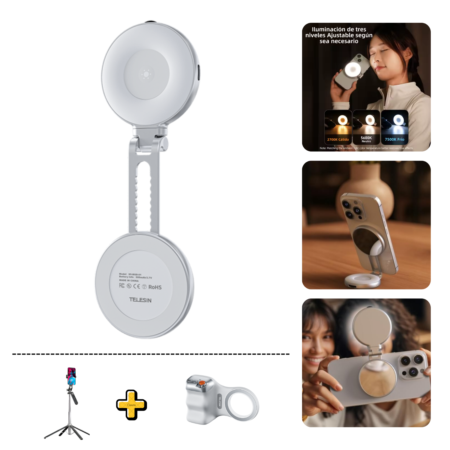 Juntos funcionan como un pequeño estudio portátil para hacer transmisiones en vivo, vlogs, TikTok, tutoriales, maquillaje, eventos o grabación de productos.