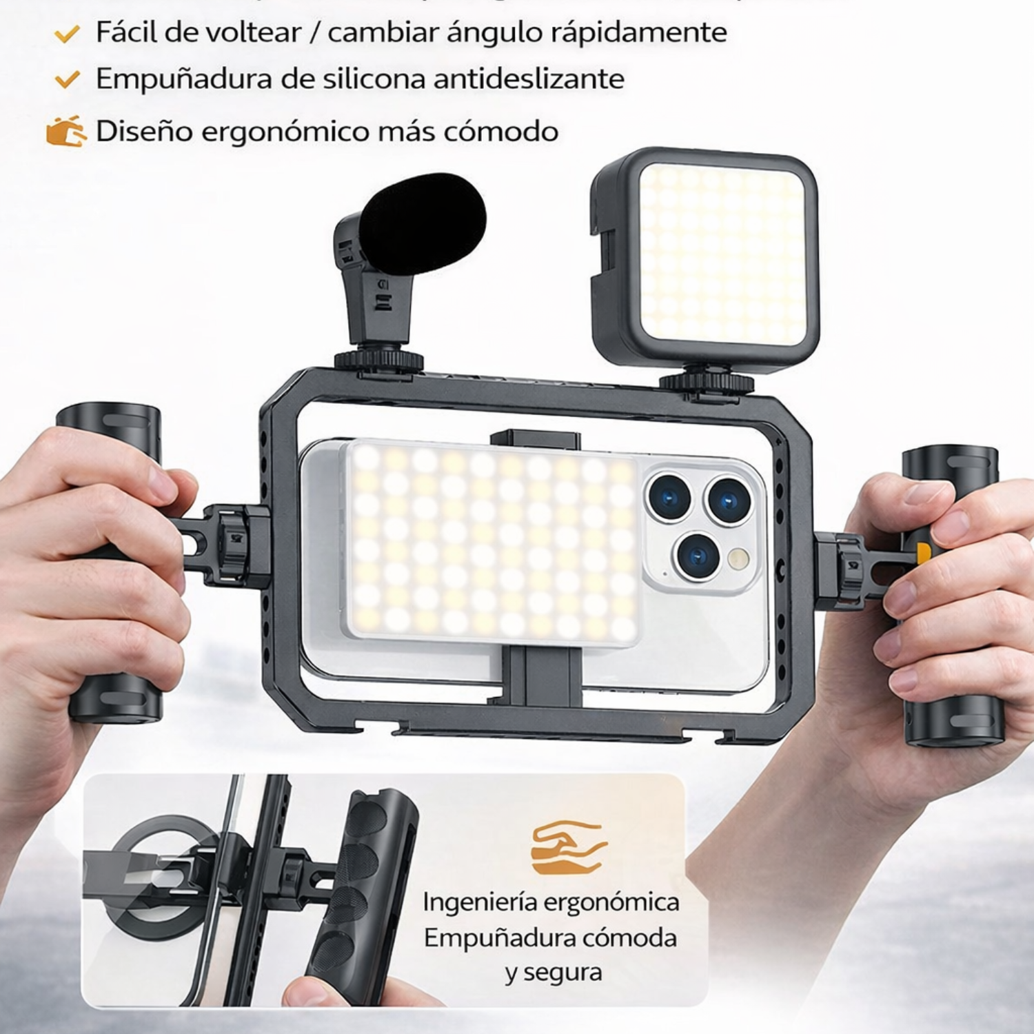 Ideal para creadores de contenido, vlogs, grabaciones profesionales y transmisiones en vivo que buscan mayor estabilidad y posibilidad de añadir accesorios a su celular.