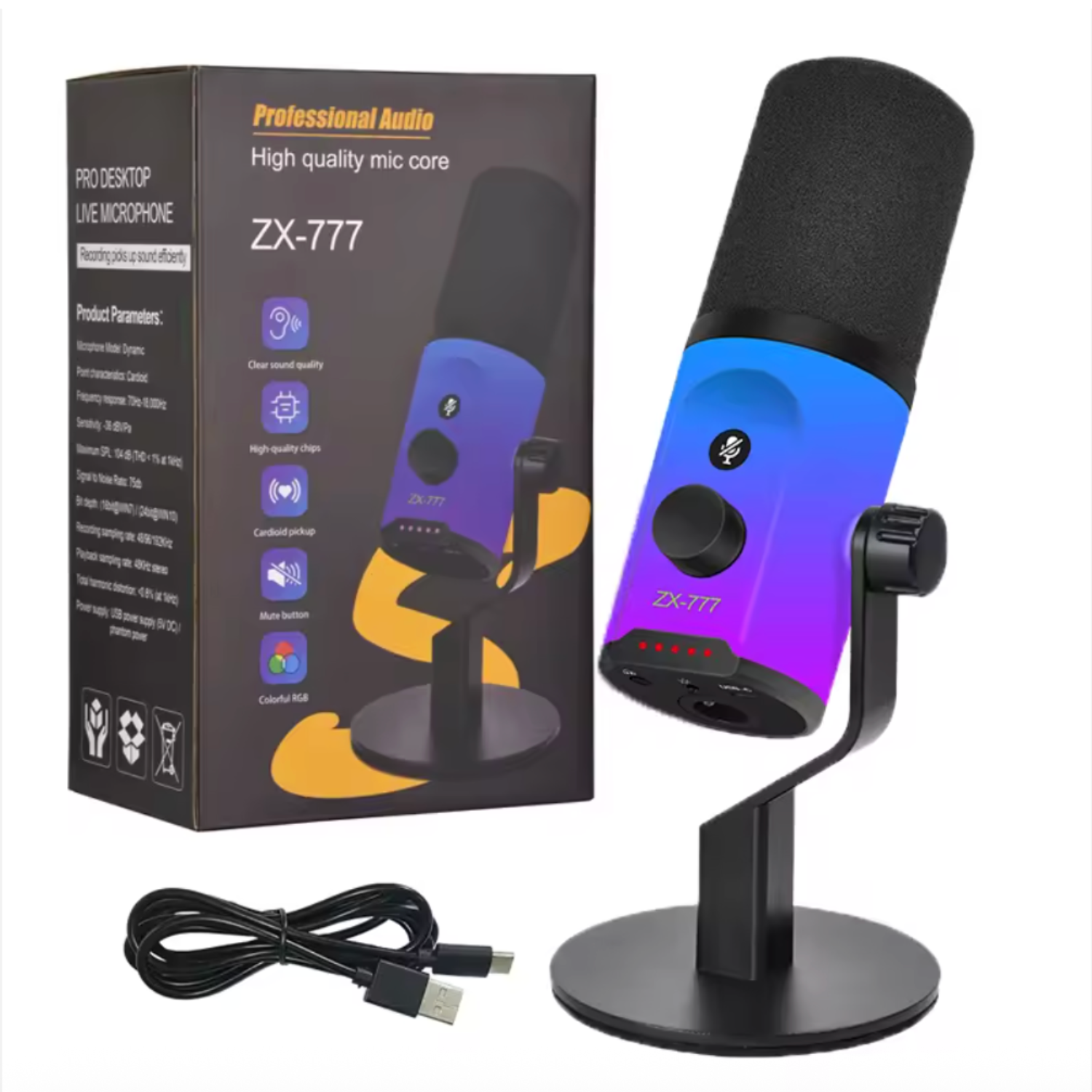 Micrófono dinámico digital diseñado para grabación, transmisiones en vivo, gaming y presentaciones musicales. Incorpora cancelación activa de ruido y sistema de iluminación RGB con efecto degradado.