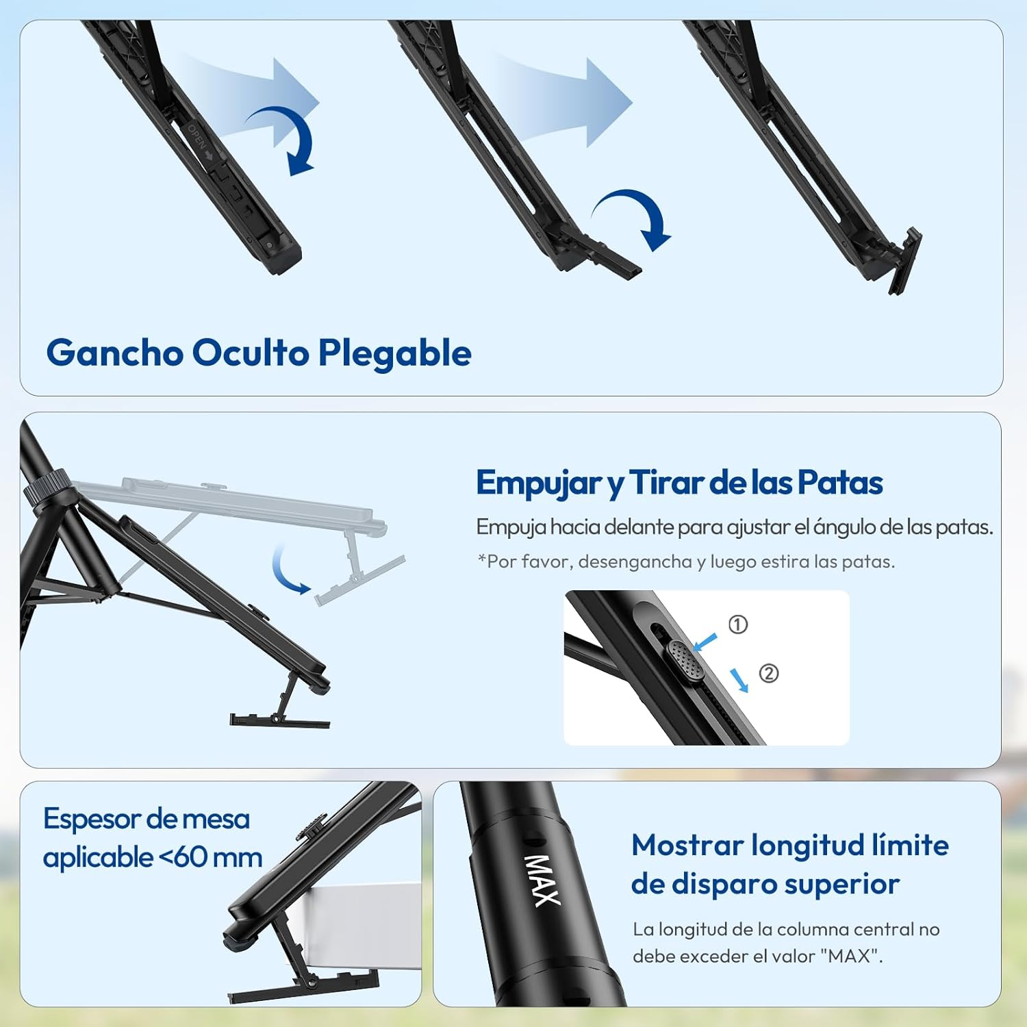 Modo Mantis para colgarlo en mesas o superficies delgadas sin accesorios adicionales.